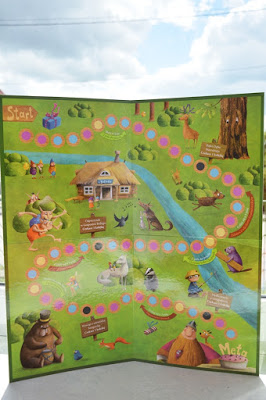 W pudełku znajdziemy książkę Tappi i urodzinowe ciasto, arkusz z pionkami do gry i prezentowymi kartami memo, kostkę do gry, podstawki do pionków, instrukcję oraz karty do gry planszowej. Ach, oczywiście pudełko zawiera również wielką barwną planszę do gry. Oto ona: