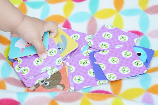 Nie, to nie Oli tak poukładał karty. Nie jest jeszcze na tym etapie. Obecnie przygląda się im, przekłada i obraca w rączkach, wkłada do pudełka i utyka we wszystkie możliwe szczeliny, na przykład w kanapie. Czasem pokaże gdzie jest pies albo owca. Jednak dopasowywanie par jeszcze przed nami.