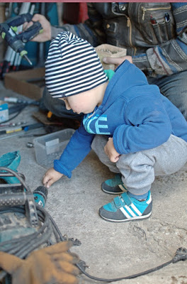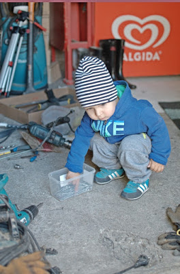 Teraz Oli jest już coraz częściej i dłużej na budowie. Ma już gdzie biegać i może nawet trochę pomóc zbierając zdemontowane z szalunku nakrętki czy też podając młotek, który zresztą jest jego ulubionym narzędziem. Jedyną rzeczą jaka może go odciągnąć od budowy jest posiłek. Kiedy już dopadnie go głód rzuca wszystko i idzie do domu jeść. Nieraz nie zdążę mu zdjąć butów a on już wyjmuje łyżkę albo talerz z szafki.