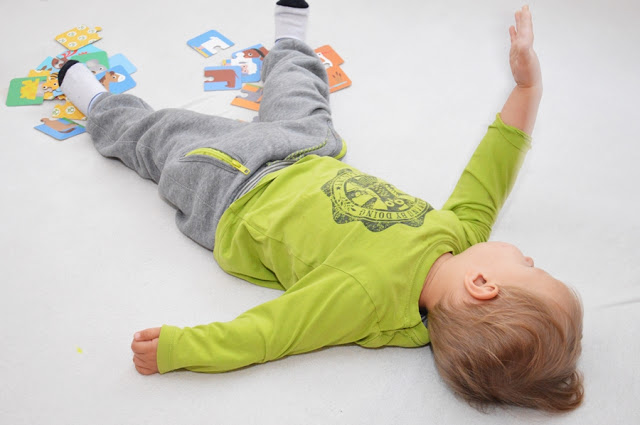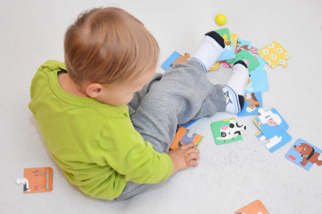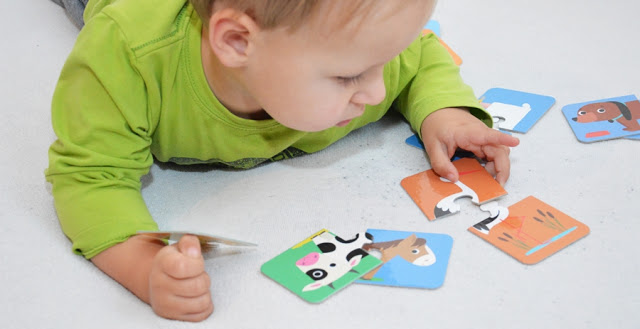 Powoli zaczynam Olusiowi podsówać różnego rodzaju zabawki edukacyjne dla dwulatków. Memory chętnie przekłada, ogląda i obraca. Jednak nie potrafi jeszcze łączyć ich w pary. O dziwo z puzzlami idzie mu o wiele lepiej. Owszem najpierw je rozrzucał. Po chwili kiedy część par połączyłam, a inne pasujące położyłam blisko siebie, Oli intuicyjnie zaczął je ze sobą łączyć.