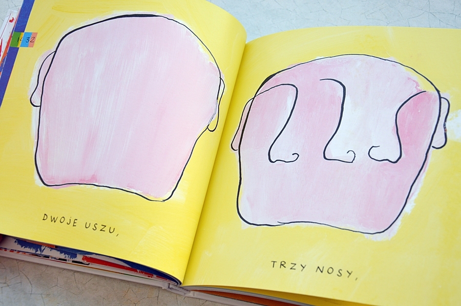 Ta książka również do typowych publikacji zdecydowanie nie należy. Tym razem autor porusza w niej już większy zakres „materiału” – od 0 do 100 nie pomijając żadnej liczby. Bardzo fajnym i ciekawym rozwiązaniem jest podzielenie tego zakresu na „dziesiątki” z położeniem bardzo dużego nacisku na ich graficzne rozróżnienie. Ale technicznie napisałam. [Te moje zapędy inżynierskie] Każda z dziesiątek zawiera ilustracje o określonej tematyce. Znajdziecie tu więc takie „10” jak: cyfry, palce, kolory, ciało, było sobie życie, kształty, gry, bajka, wyścigi i zgadywanki. Fajnie, prawda?!