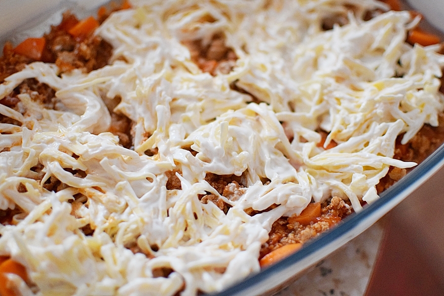 Zapiekanka ziemniaczana z mięsem mielonym i warzywami.