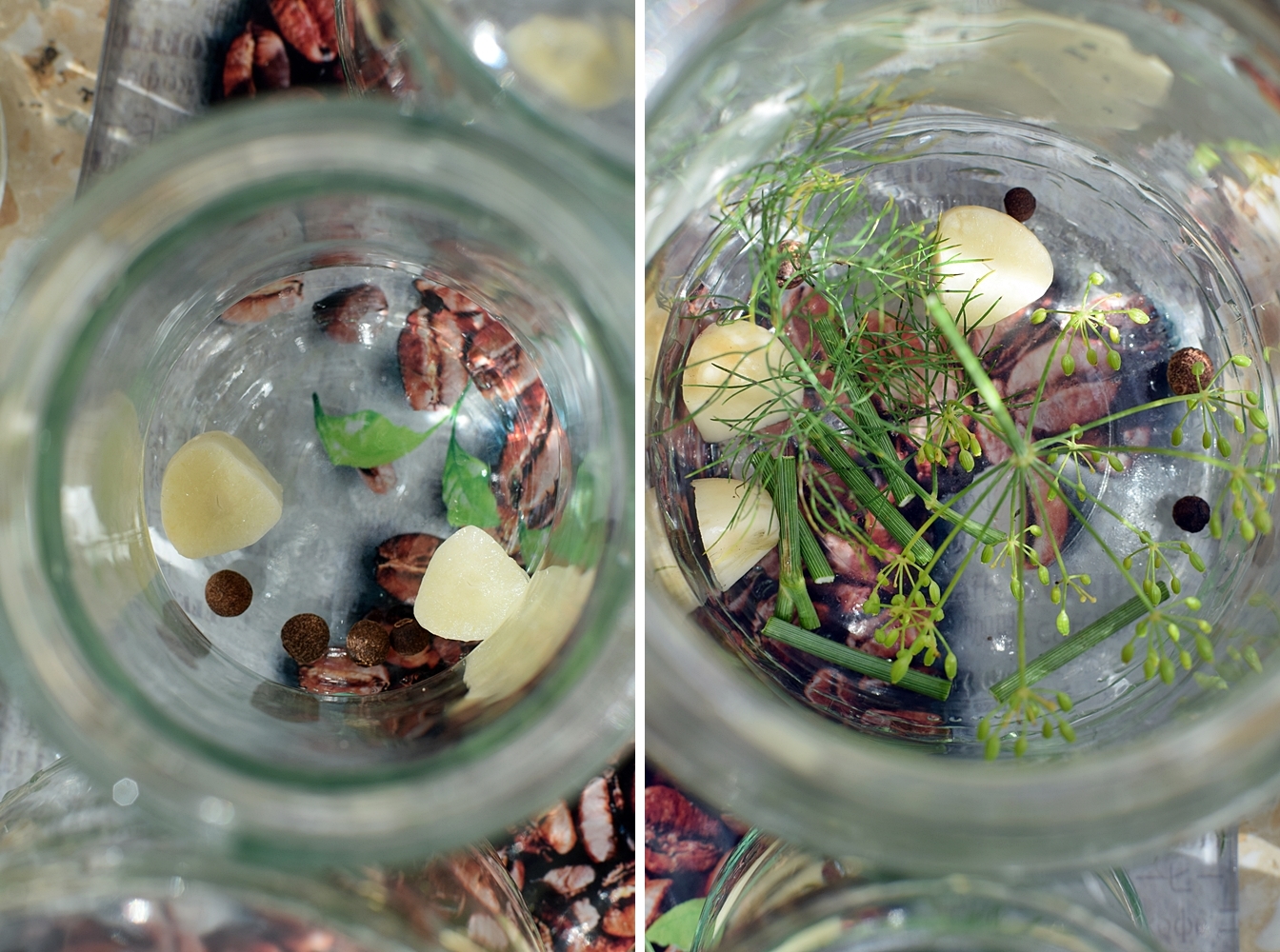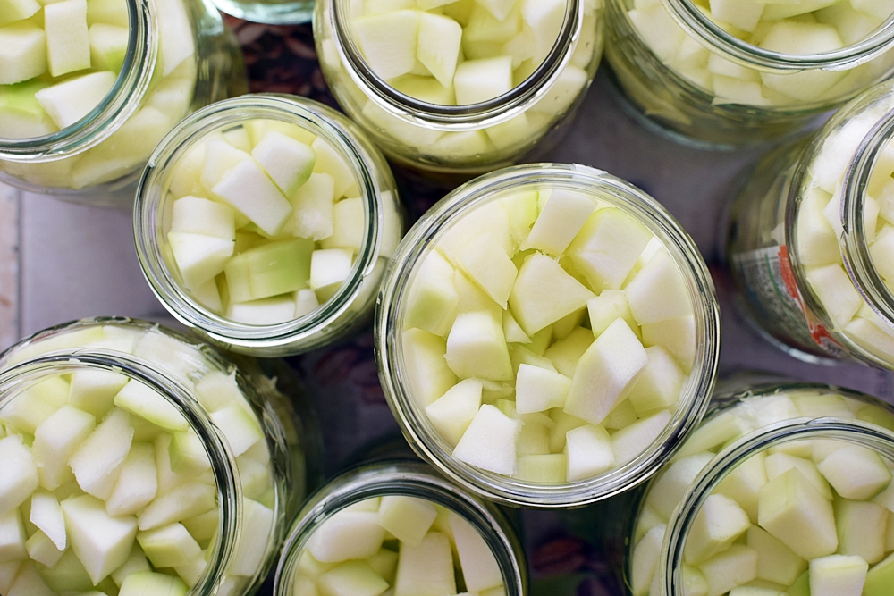 Cukinię obrać, wydrążyć środek i pokroić w kostkę. Do słoików włożyć ziele angielskie, czosnek, koper i kabaczki.
