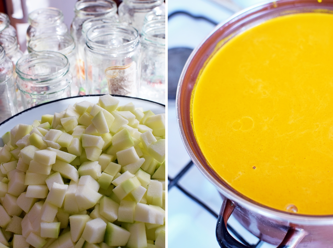 Do garnka wlać wodę, zagotować. Dodać do wody ocet, cukier, kurkumę, sól. Zagotować zalewę. Gotową zalewą zalać cukinię, zakręcić słoiki i pasteryzować.