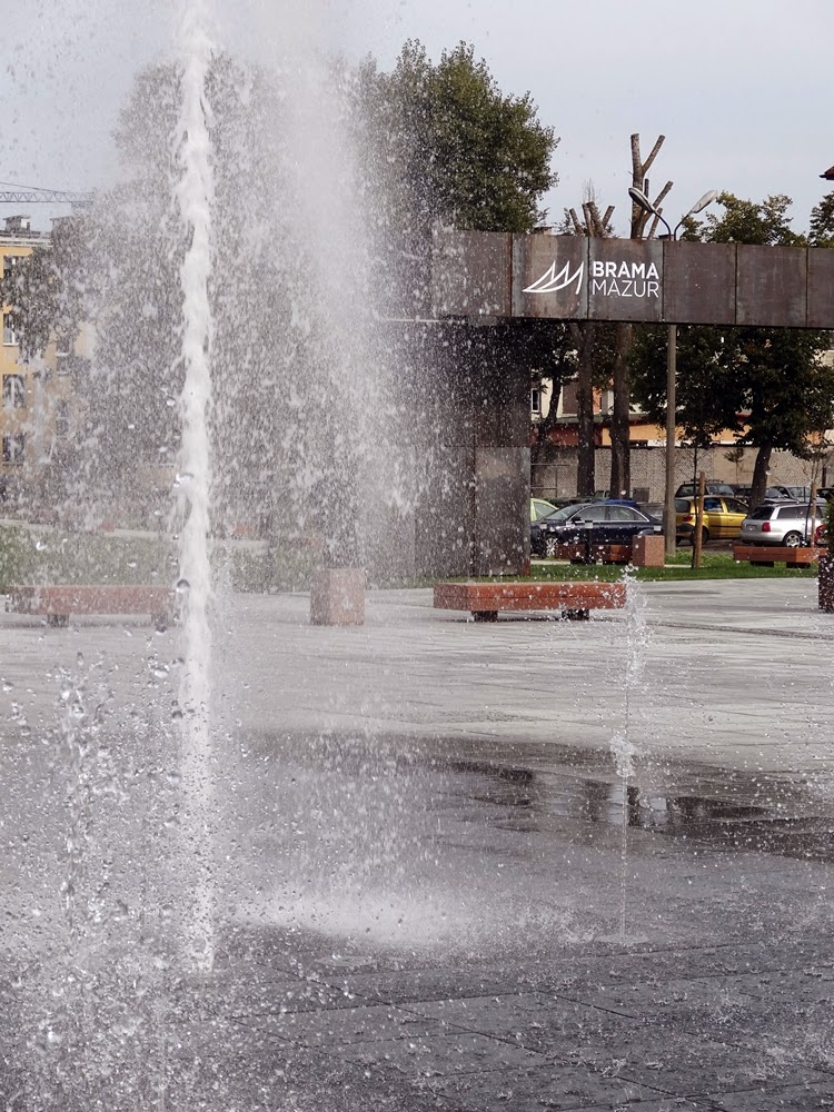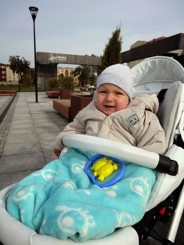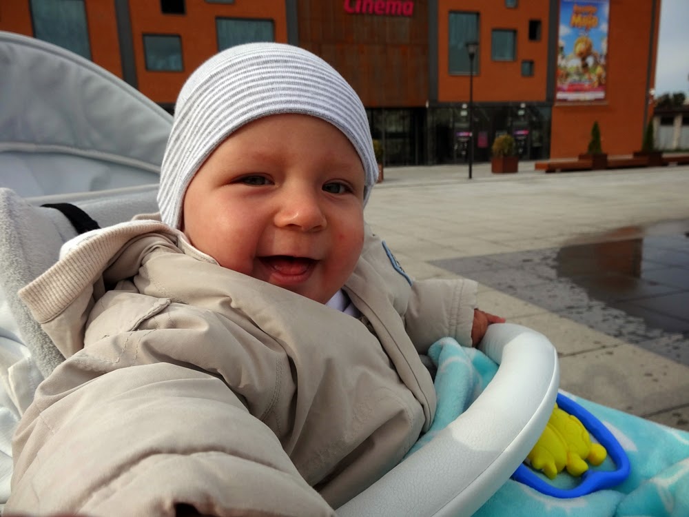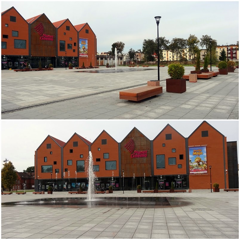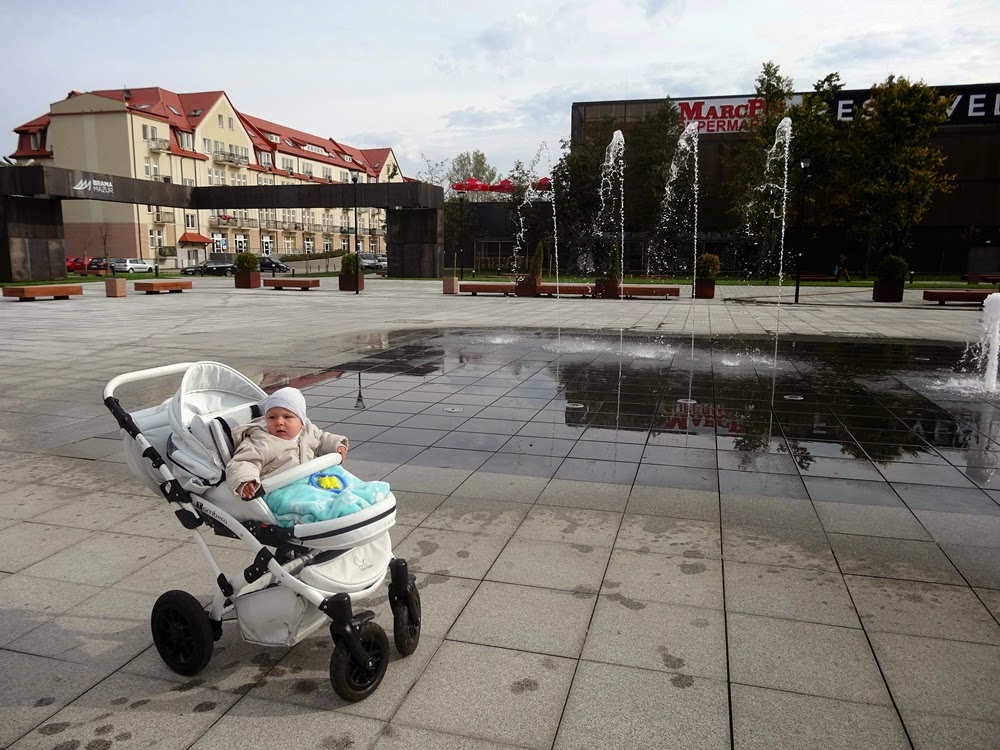 Przygalerii jest Multikino. Nie byliśmy tam. Oli jest zbyt mały a sami nie mamy zbytnio jak się wyrwać. Poza tym nic się nie stanie jeśli zaczekamy na kino a dobry film można tez obejrzeć w domu. Między kinem a galerią jest bardzo przyjazny dla ludzi w każdym wieku skwer. Szerokie ławy, ławeczki. Bardzo dużo miejsca do biegania i zabawy. A co najważniejsze, przynajmniej dla Olusia na tym etapie, sekwencyjna duża fontanna. Oli patrzyła na nią wzdychając z zachwytu i machając nóżkami i rączkami dobre pół godziny.