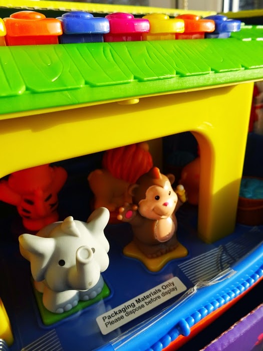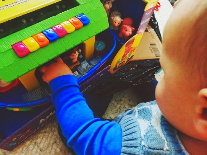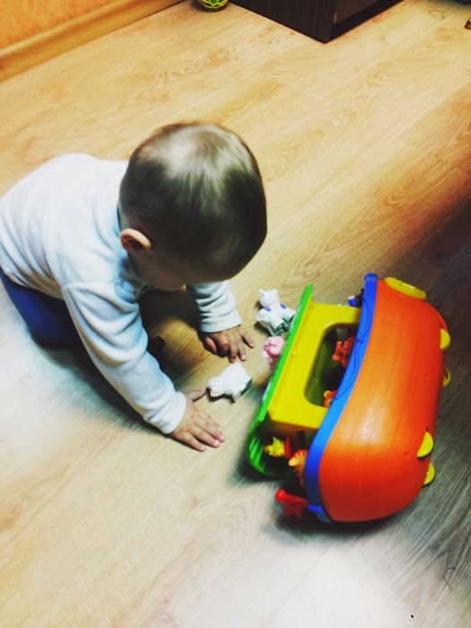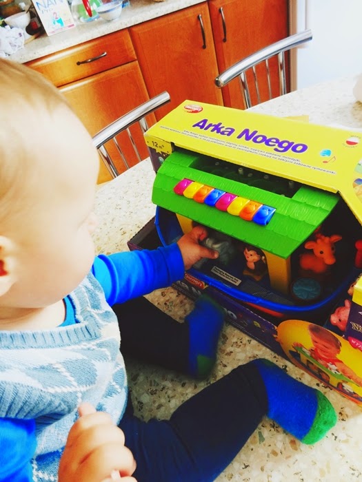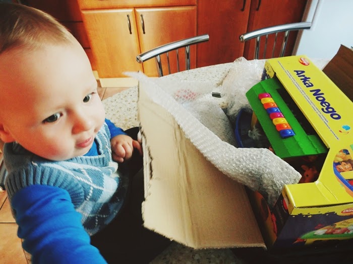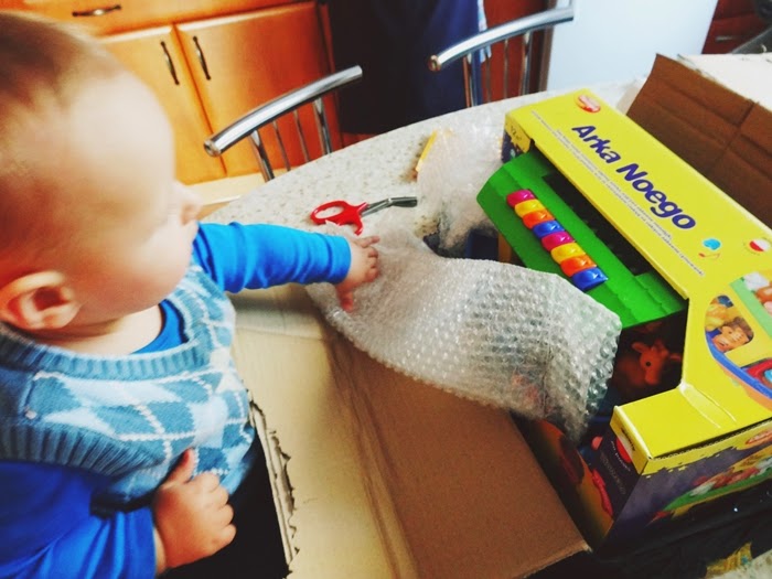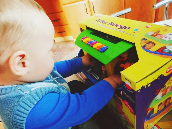 Jak tylko kurier dostarczył nam paczkę od razu zabraliśmy się za jej rozpakowywanie. Oli gdy tylko zobaczył kawałek dachu i pierwsze zwierzątka od razu bardzo chętnie zaczął mi pomagać. Oczywiście od razu nastąpiło testowanie. Obracanie, jeżdżenie, rzucanie, przewracanie arki oraz gryzienie, rzucanie i oglądanie z każdej strony zwierzątek oraz pierwsze próby grania na pianinku.