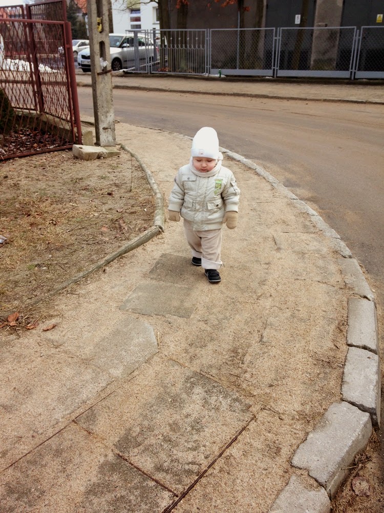 Ten tydzień to przełom w samodzielnym poruszaniu się Olusia. Nie chce już zbytnio podróżować w wózku. Coraz częściej podczas zakupów w mieście muszę go choć na chwilę postawić na nogi i pozwolić mu pochodzić. Zaś w drodze powrotnej do domu obowiązkowo cała naszą ulicę Oli pokonuje na swoich nogach. mamy to szczęście, że choć położenie domu mamy rewelacyjne to mieszkamy na cichej i spokojnej ulicy Przejeżdżające samochody to u nas rzadkość, co więcej, ludzie przyzwyczaili się nawet, że częściej chodzą ulicą nić chodnikami, które są w opłakanym stanie.