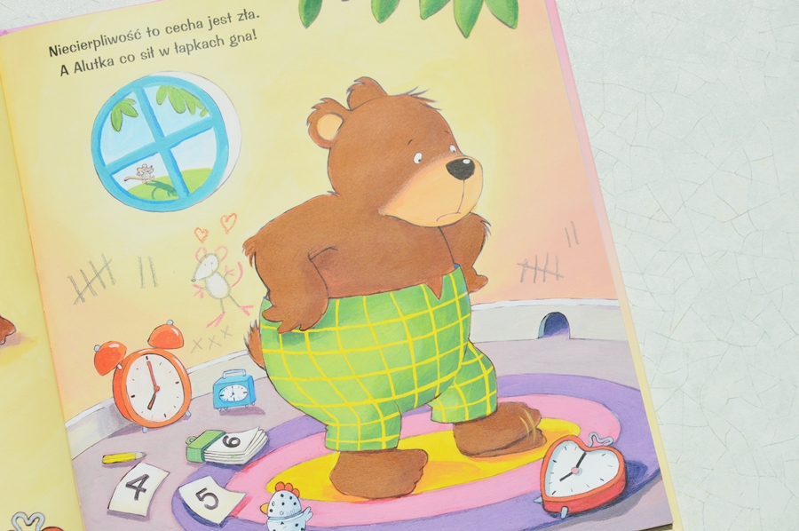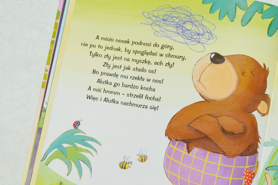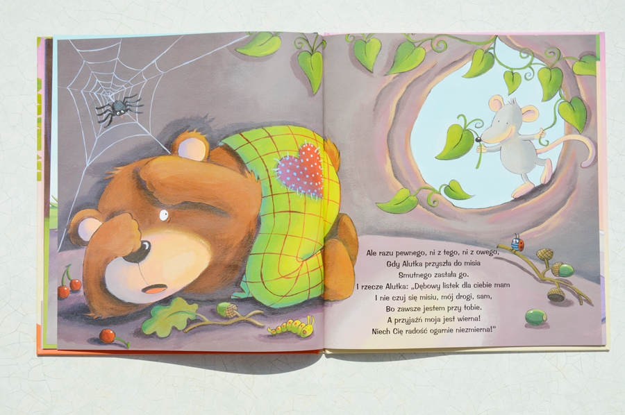 Plus za duży format, twardą oprawę, czytelną czcionkę i bajeczne ilustracje. Książka dla młodszych dzieci, która w ciekawy sposób pokaże im jak wielką wartością jest przyjaźń. Nawet jeśli przyjaciółmi są wielki i marudny miś oraz mała rezolutna myszka. Umiejętność poszukiwania kompromisu, wyciągnięcia ręki na zgodę czy rozmowy i wsparcia to jedne z elementów przyjaźni jakie dziecko pozna dzięki tej książce. Zdecydowanie warto po nią sięgnąć.