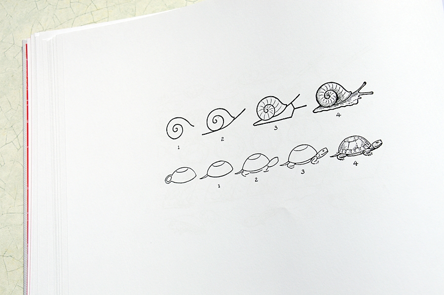 Spodziewałam się standardowych kółek, kwadratów, trójkątów itp. które często znajdujemy w tego typu publikacjach, a które mają nam pomóc zachować proporcje. Tu jednak tego nie ma, no może odrobinę. Za to autor krok po kroku we wręcz banalny sposób pokazuje nam ja w dosłownie kilka-kilkanaście minut wyczarować piękne rysunki. Okazuje się, że rysowanie wcale nie jest takie trudne i wymaga wielkiego talentu!