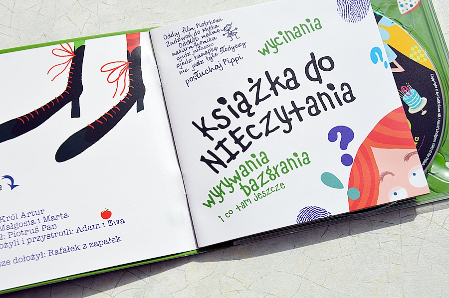 W środku opakowania znajdziecie mini książkę do nieczytania, czyli wycinania, wyrywania, bazgrania i co tam jeszcze z labiryntami, wywiadami, żartami, wyjątkowym zaproszeniem, a nawet reklamą smarowidła na piegi. Będzie się działo!