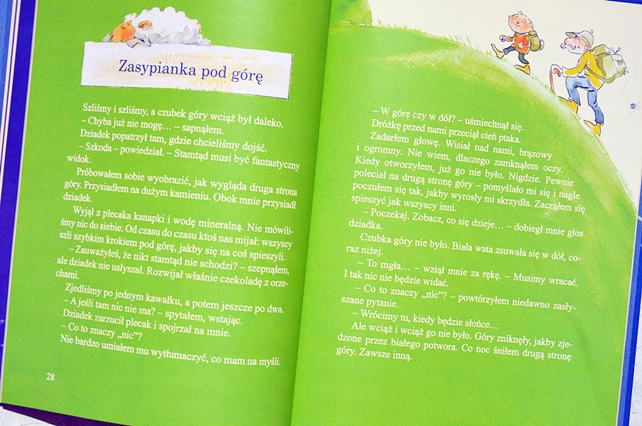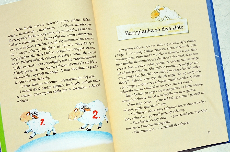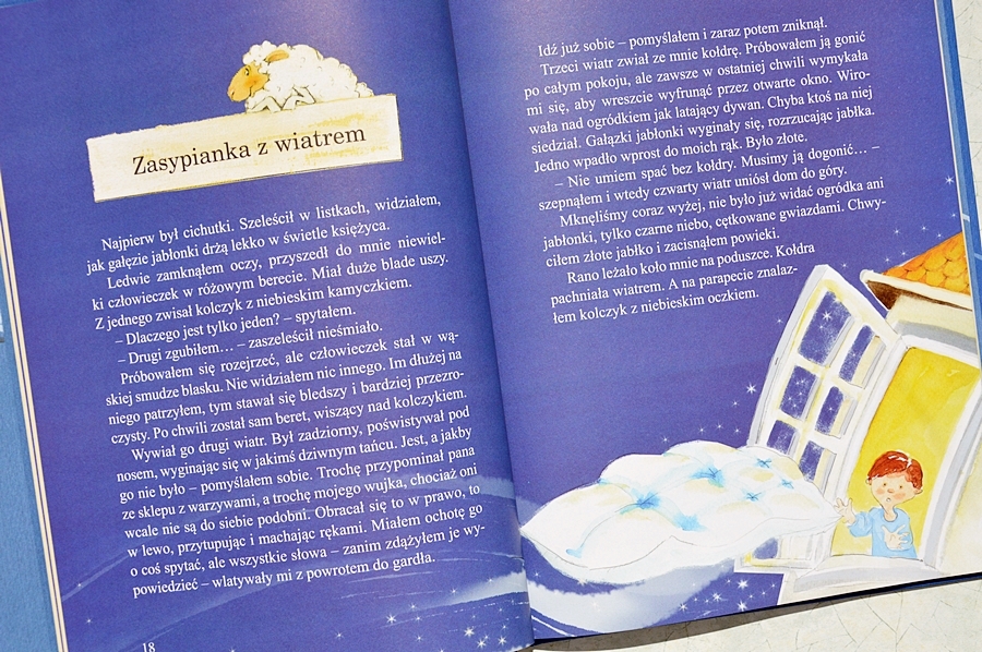 Coś dla dzieci, które są już wykazują dość mocne zainteresowanie słuchaniem tego, jak ktoś czyta. Ilustracje są tutaj jedynie dodatkiem i nic specjalnego w nich nie znajdziecie. Co do samych zasypianek – są to krótkie opowiadania około dwustronicowe. Nie są to standardowe bajki, jakich z pewnością znacie wiele. Zasypianki to historie pełne marzeń i niezwykłych zdarzeń, które rozbudzają wyobraźnię. Ciekawa alternatywa dla tradycyjnych bajek jak Czerwony Kapturek czy Trzy świnki.