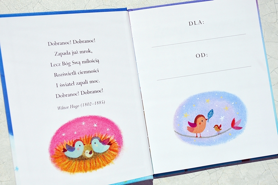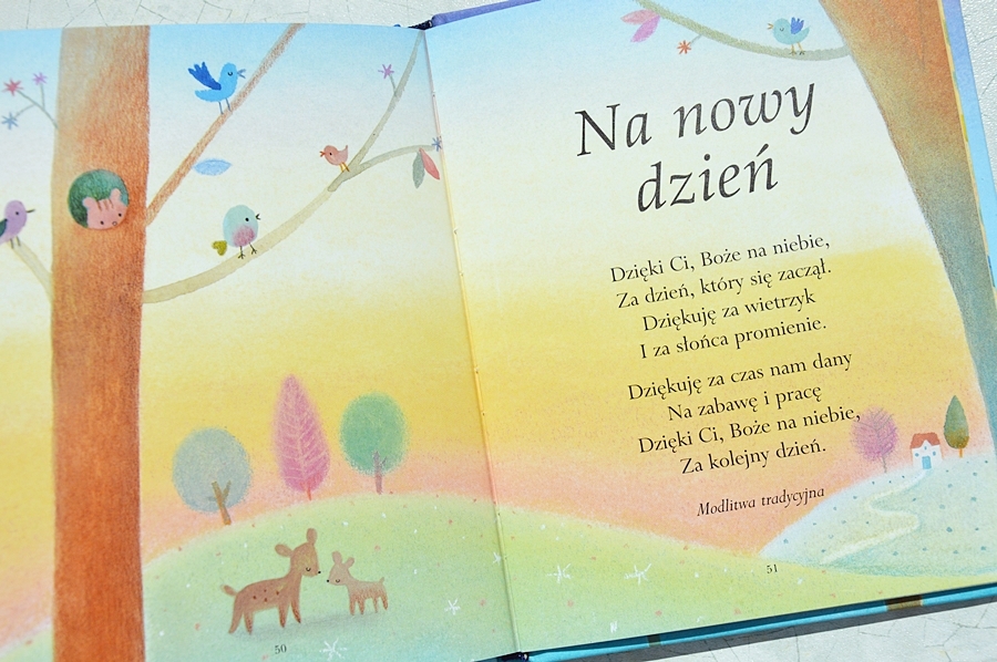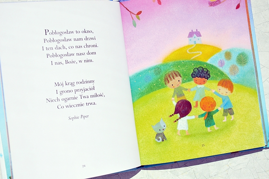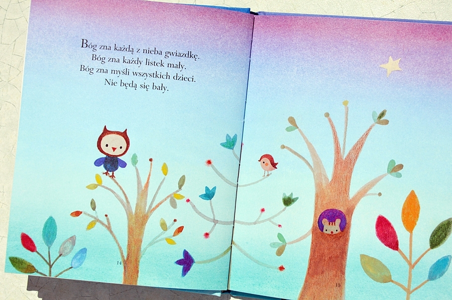 Nie jestem zbytnio religijna. Jednak zostałam wychowana w wierze katolickiej i ochrzciliśmy naszego synka. Nie unikam więc jak ognia publikacji, które choćby w niewielkim stopniu mogą przybliżyć Olusiowi kwestie wiary w Boga. Ten niewielkich rozmiarów zbiór modlitw przygotowanych z myślą o dzieciach przykuł moją uwagę. Nie znałam wnętrza tej książki, kiedy ją zamawiałam i obawiałam się trochę, że będzie to taki „sztywny” modlitewnik. Na szczęście zostałam mile zaskoczona. W książce tej znajdziecie modlitwy lekko wierszowane i rymowane, co pozwoli dziecku na łatwiejszy ich odbiór. Do tego niezwykle piękne ilustracje, które zachwycą nie tylko Was rodziców, ale i Wasze dzieci. Piękna, malowniczo wręcz wydana. Jedyny mankament to dość skomplikowane słownictwo, które od czasu do czasu się w niej pojawia. Mimo to polecam.