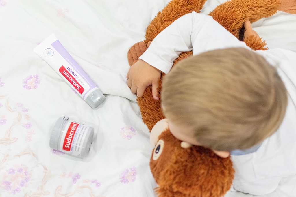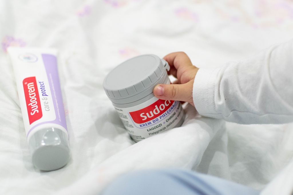 Nie nakładałam maści zapobiegającej odparzeniom za każdym razem, ale robiłam to dość często. Po co? Po ty, bo odżywić skórę i stworzyć dodatkową barierę ochronną przed otarciami, podrażnieniami czy zakażeniami. Ważne, by nakładać na suchą skórę dziecka cienką warstwę maści na odparzenia, np. maść ochronną Sudocrem care & protect. Więcej nie znaczy lepiej, wręcz przeciwnie. Kilkukrotnie przydarzyły się chłopcom poważniejsze odparzenia i wtedy musieliśmy już sięgać po krem z cynkiem (np. krem do pielęgnacji skóry Sudocrem), aby jak najszybciej złagodzić podrażnienie skóry, nawilżyć ją i chronić.