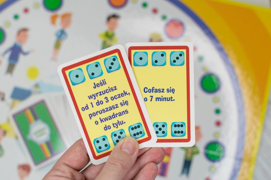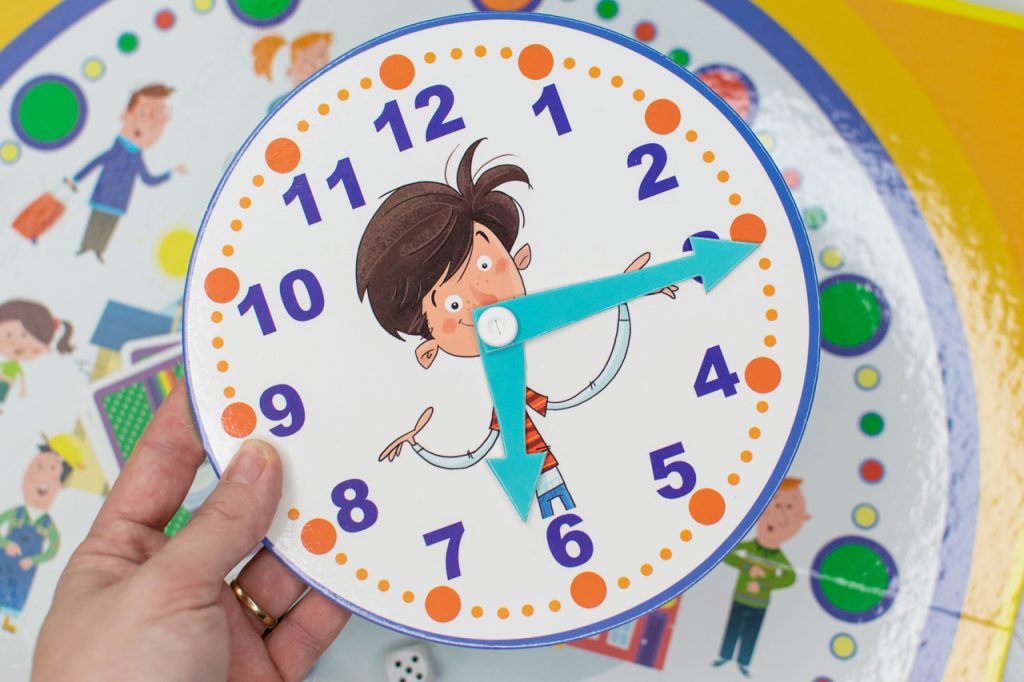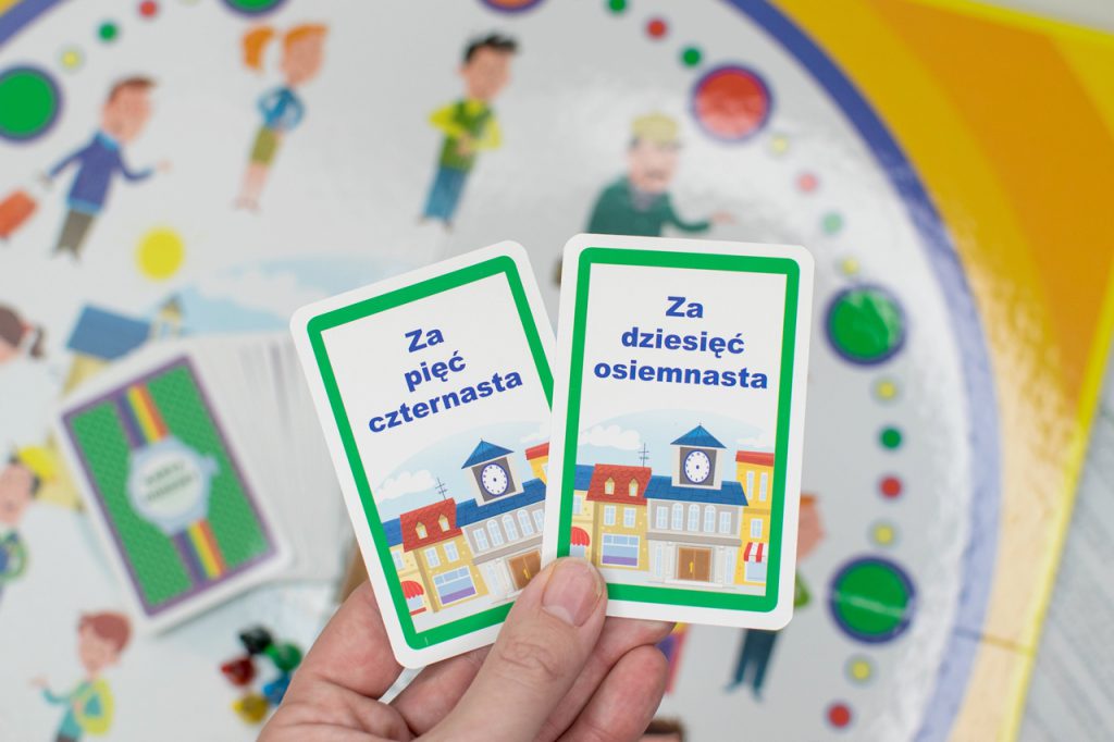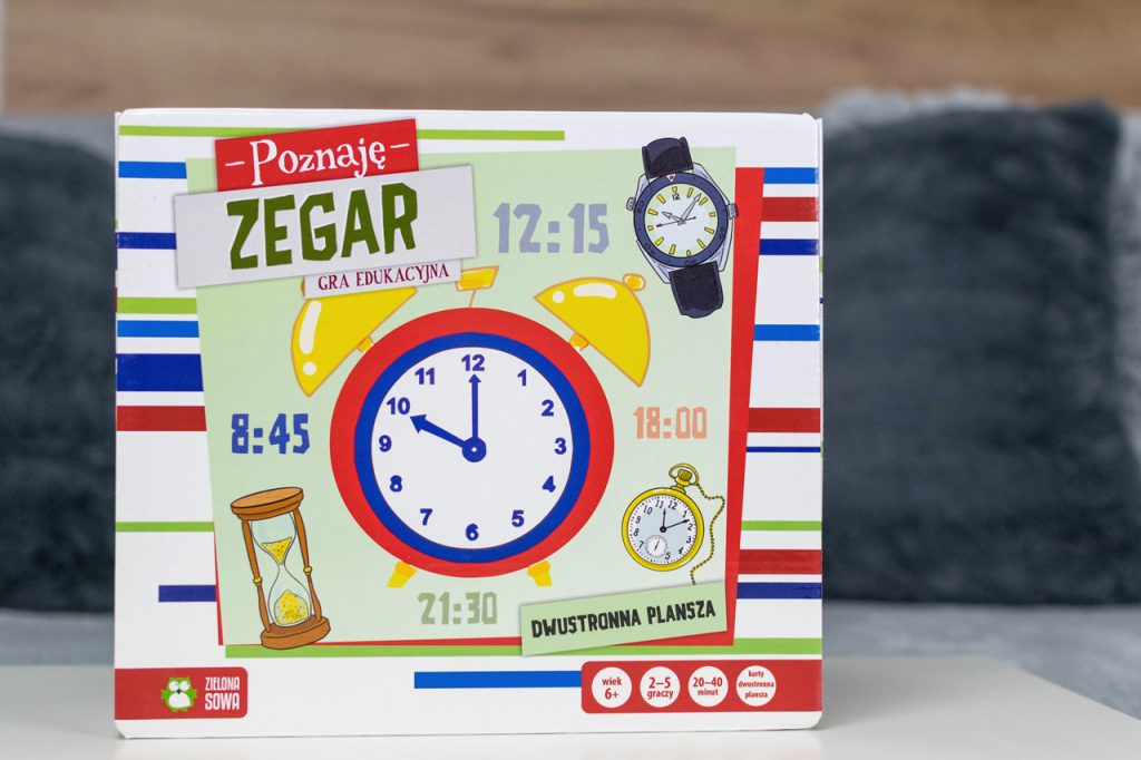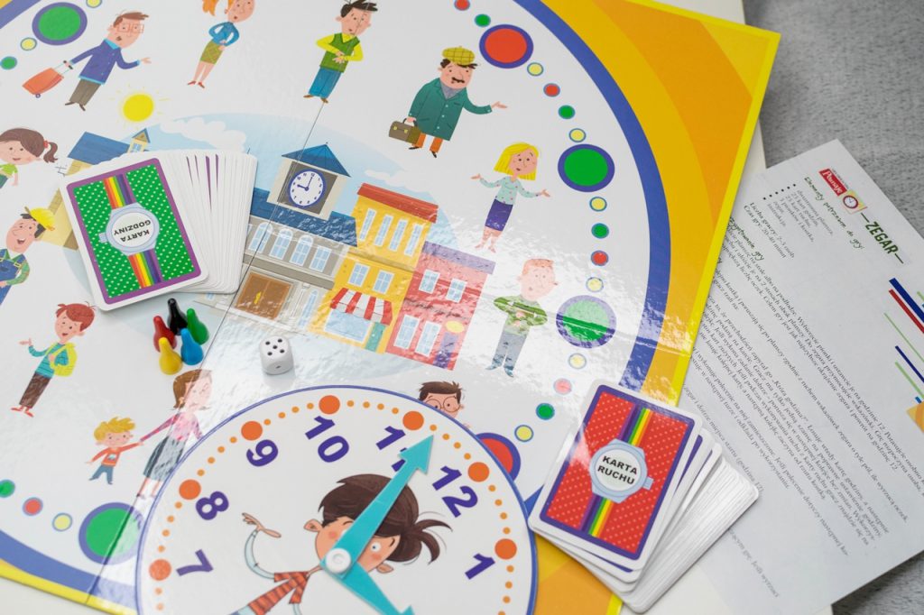 Ciekawa forma ćwiczenia umiejętności odczytywania godzin na zegarze. Dwustronna plansza to dwa różnorodne warianty gry: jedna to tradycyjna planszówka, po której gracze poruszają się pionkami zgodnie z ilością wyrzuconych na kostce oczek oraz druga, w której gracze mają za zadanie ustawiać odpowiednią godzinę na tarczy zegara zgodnie z jej zapisem słownym na kartach do gry.