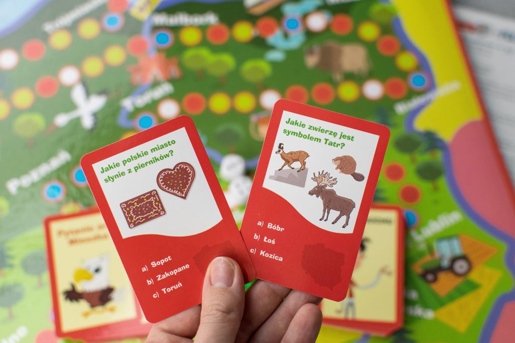 Orzeł Mieszko zabierze dziecko w niezwykłą przygodę, podczas której dziecko pozna bliżej naszą ojczyznę. Dwustronna plansza to ponownie dwa warianty gry, które urozmaica zestaw kart ruchu oraz kart z pytaniami od orła Mieszka. Pytania nie są zbyt trudne, ale dla niejednego 6-latka mogą się okazać sporym wyzwaniem. Orzeł Mieszko zapyta dzieci m.in. „Czym jest Kraina tysiąca jezior?”, Co wydobywano w Wieliczce?”, „Jakie miasto słynie z cebularzy?” czy „Jaki jest najsłynniejszy skalny labirynt w Polsce?”. Przyznaję, że mi też część z tych pytań sprawiła niemały problem. Uczymy się w sumie przez całe życie. ?