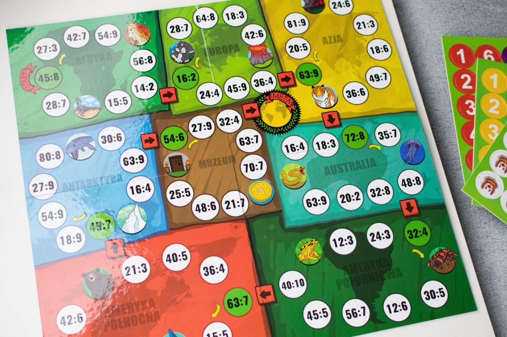 Dzielni podróżnicy wyruszą w świat by zebrać najróżniejsze pamiątki charakterystyczne dla poszczególnych kontynentów. Bardzo fajna propozycja ćwicząca umiejętność dzielenia. Po raz kolejny w tej serii zachwycają nietuzinkowe rozwiązania graficzne w projektowaniu plansz. Jak to mocno cieszy, że każda z plansz w tej serii jest całkowicie odmienna od pozostałych w tej serii. Nic chyba bardziej nie zniechęca do gry w nową pozycję jak powtarzający się koncept.